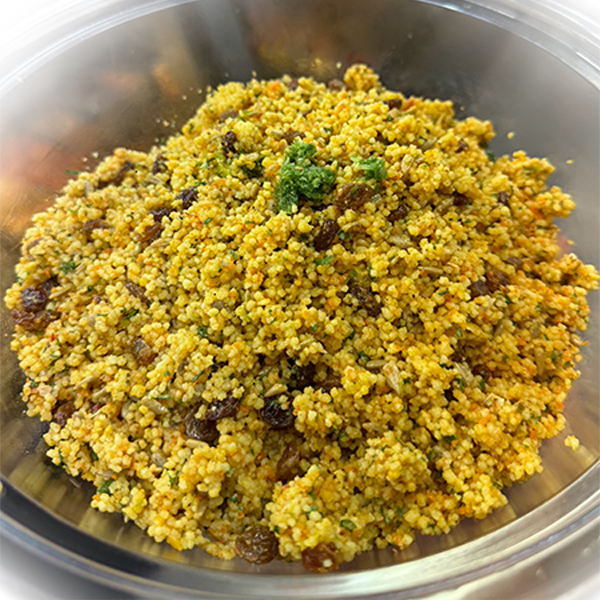Pleine de couleur et de goût, une bouchée de soleil du Maghreb. Composée de couscous, de graines de tournesol, de raisins secs, de légumes frais et d’une vinaigrette parfumée aux épices, cette salade offre une explosion de saveurs sucrées-salées. Portion de 1 kg.